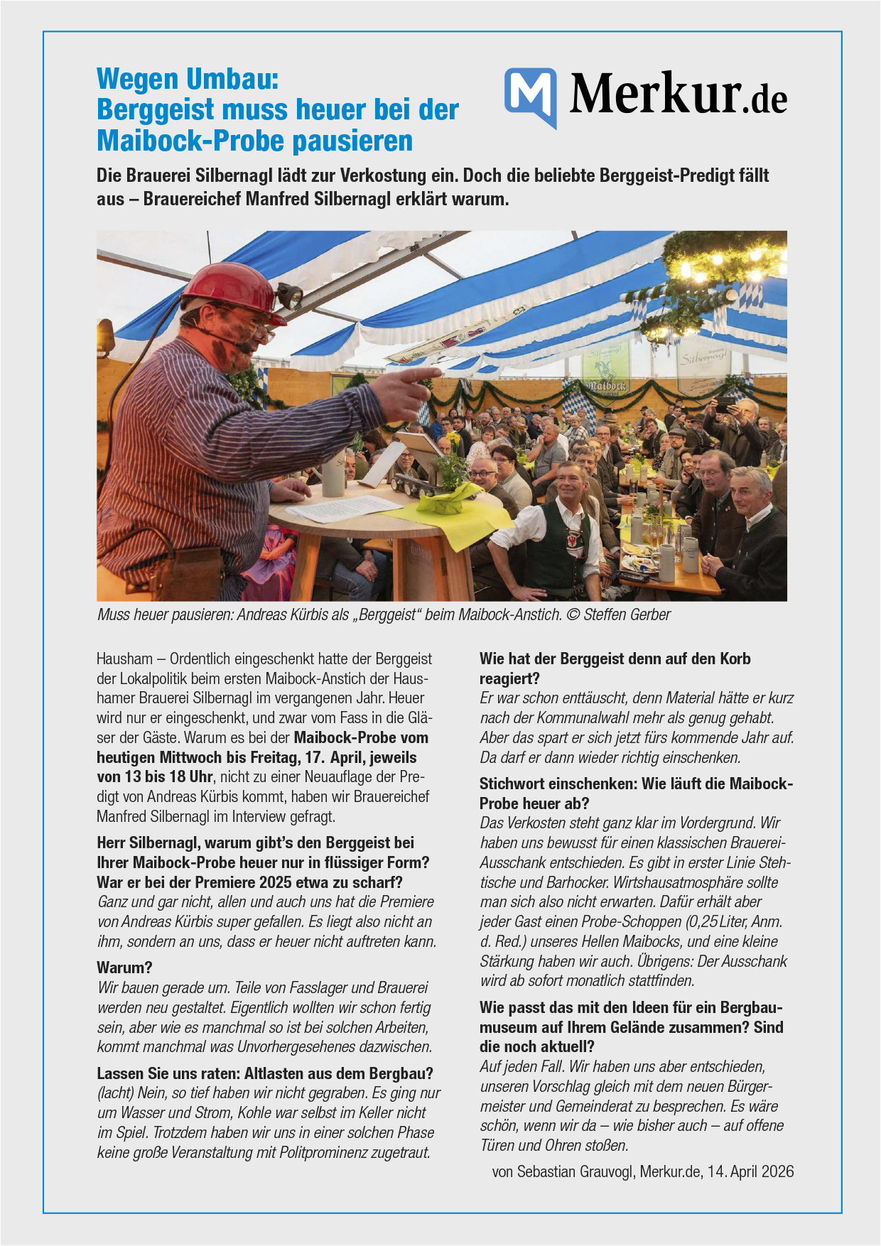 Heuer wird nur er eingeschenkt, und zwar vom Fass in die Gläser der Gäste. Warum es bei der Maibock-Probe vom heutigen Mittwoch bis Freitag, 17. April, jeweils von 13 bis 18 Uhr, nicht zu einer Neuauflage der Predigt von Andreas Kürbis kommt, haben wir Brauereichef Manfred Silbernagl im Interview gefragt.